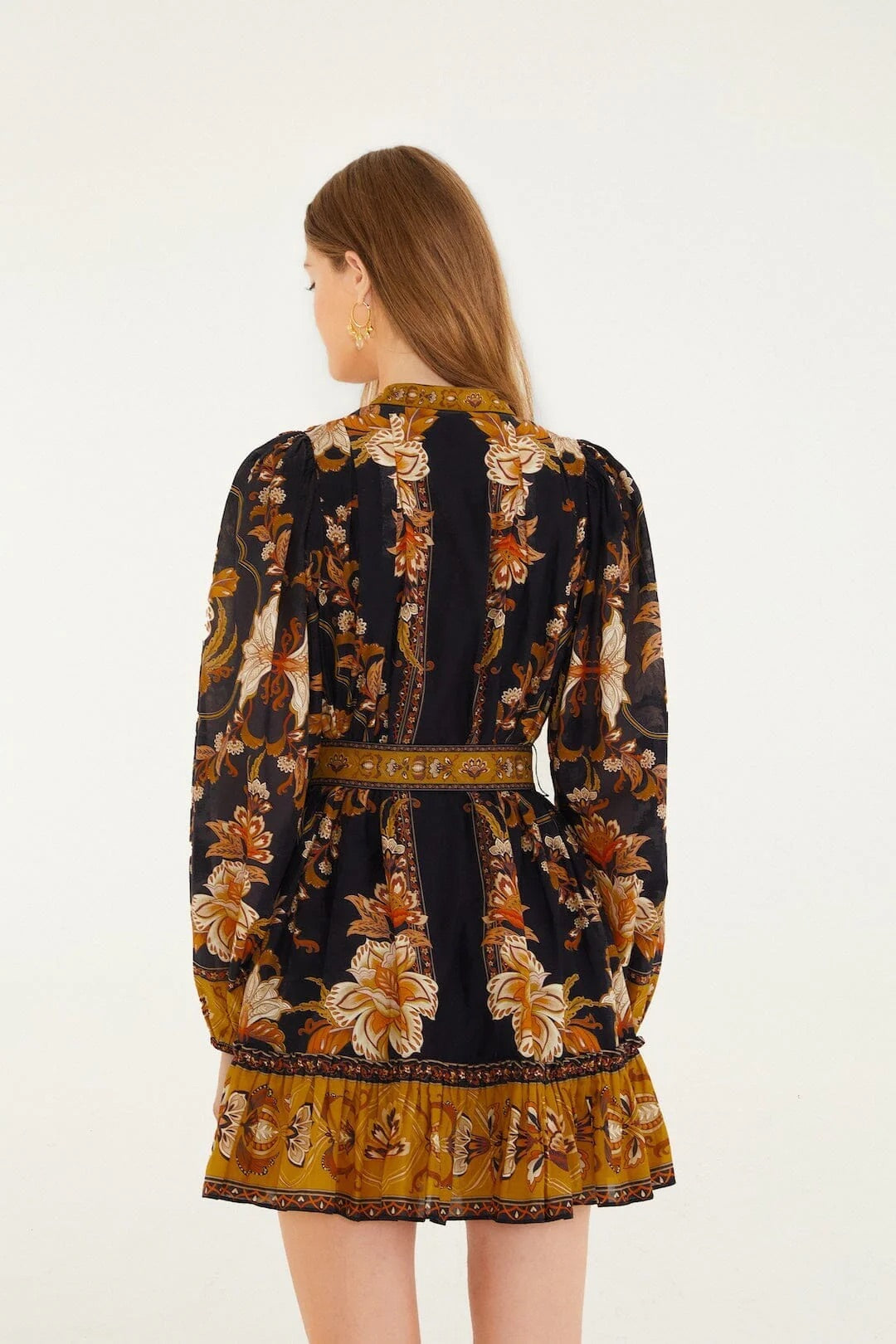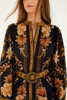 Farm Rio - Black Majestic Garden Beaded Buckle Long Sleeve Mini Dress
