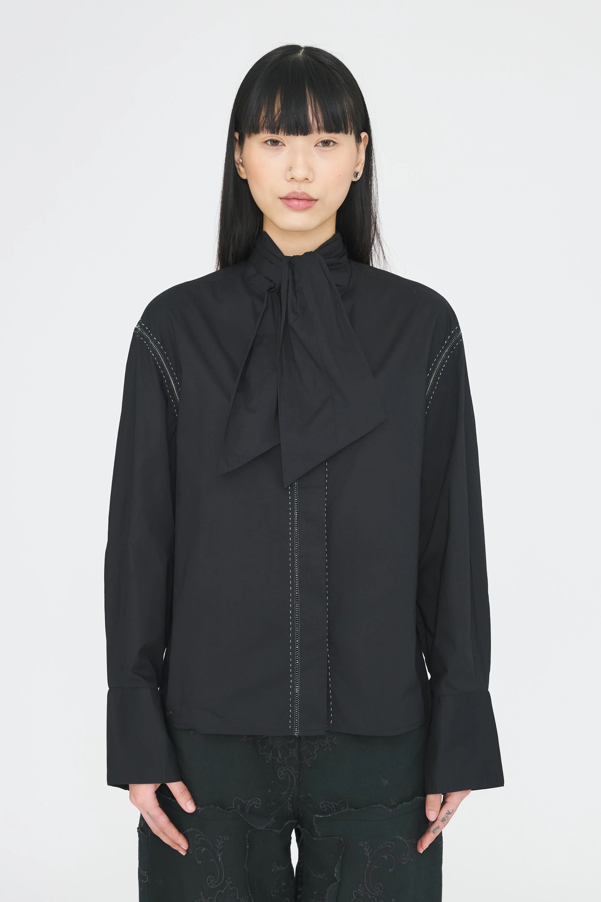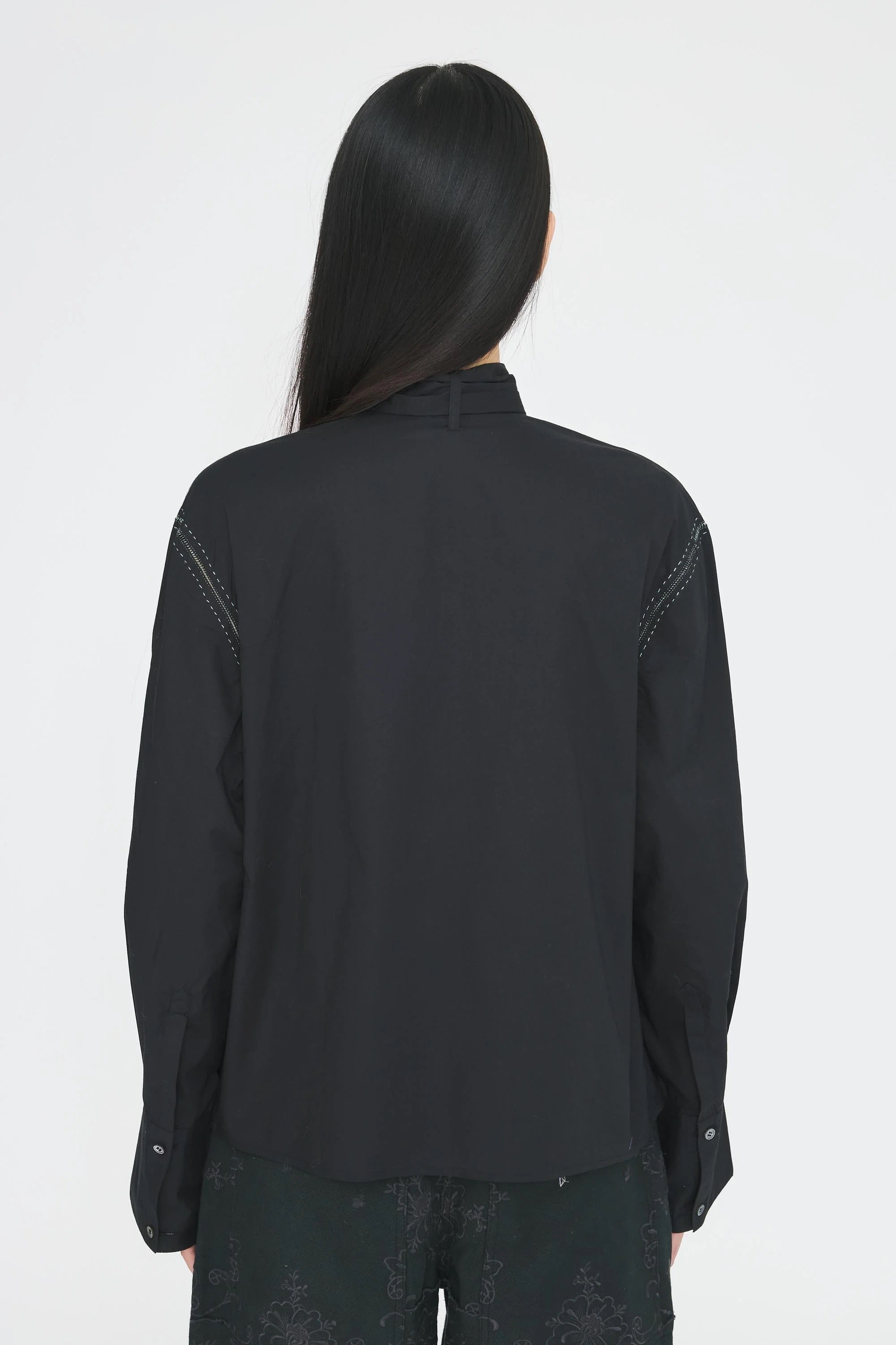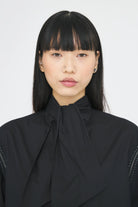Blusa in popeline di cotone. Ricamata a mano sui bottoni e sulle aperture delle maniche. Fiocco rimovibile.