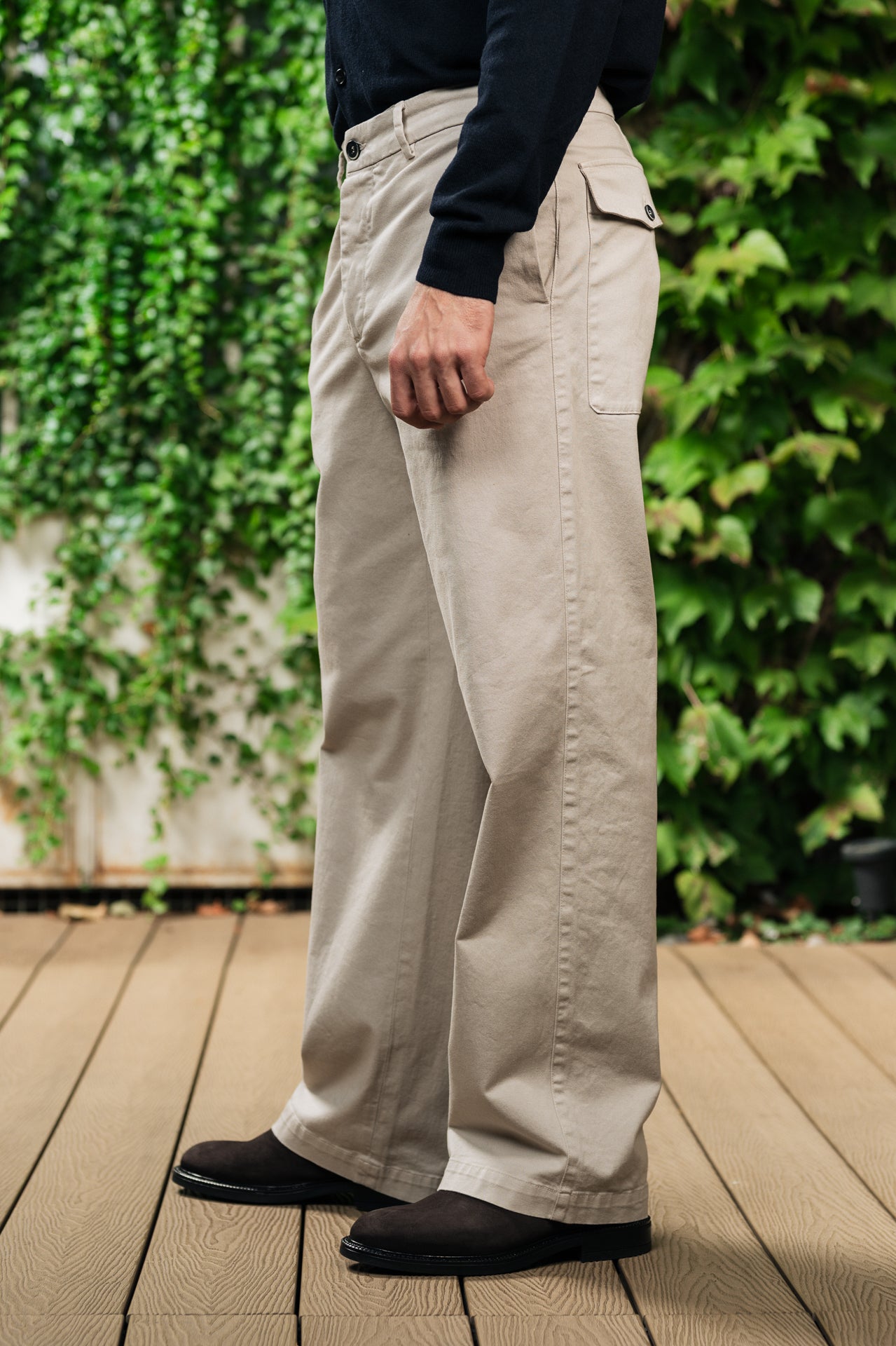 – Tasche applicate con patta e bottone sul retro
