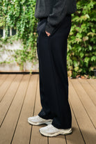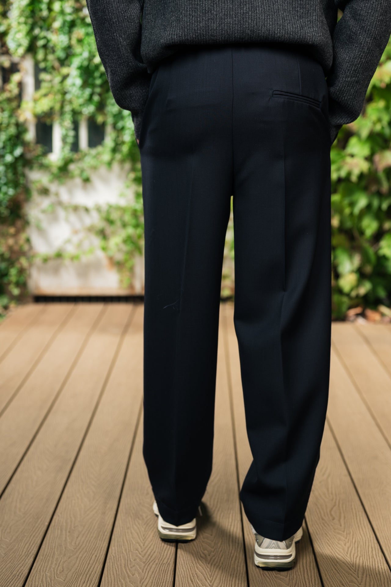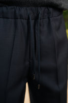 Pantaloni large fit in lana con tasche frontali a 1/8, tasca a filetto sul retro e coulisse in vita. Fondo gamba 22 cm.