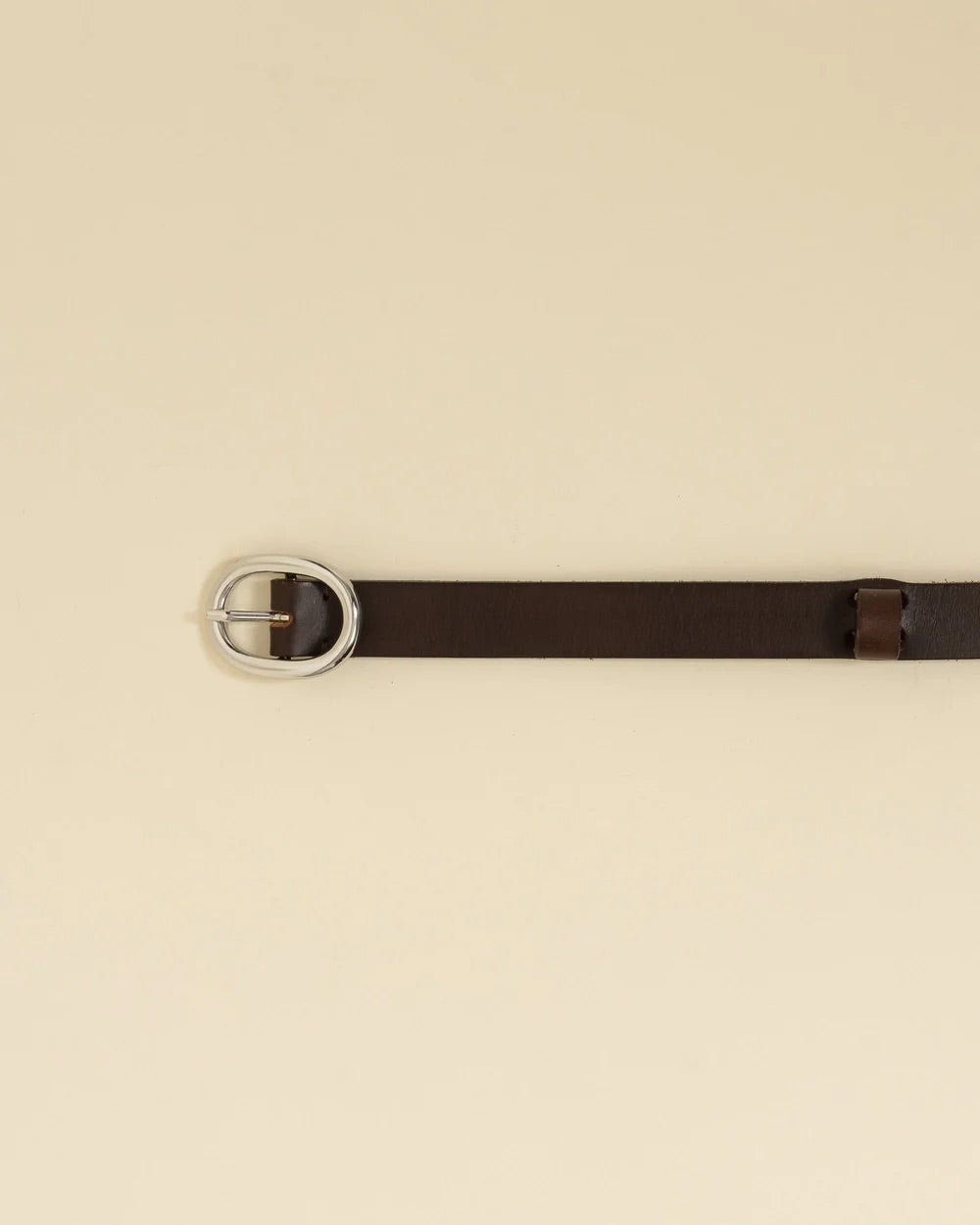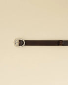 cintura in pelle di bovino, colore moro, chiusura in metallo, fibbia ovale, stampa logo all'interno