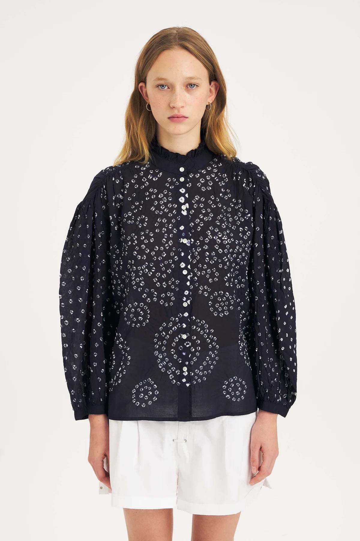 Blusa in voile di cotone, leggera e deliziosa da indossare. Si distingue per il suo colletto rotondo delicatamente arricciato, arricchito da un volant, e le sue maniche con polsini abbottonati decorati con bottoni in madreperla, che aggiungono un tocco femminile e raffinato. Realizzata con la tecnica artigianale Bandini, sviluppata nel corso degli anni nei nostri atelier e celebrata questa stagione. Ispirata allo shibori giapponese, questo metodo di tie & dye prevede la legatura a mano del tessuto, permettendo al colore di fissarsi, per poi sciogliere i fili e rivelare un motivo unico per ogni pezzo. Per preservare la vivacità dei colori, si consiglia il lavaggio a mano, non stirare.