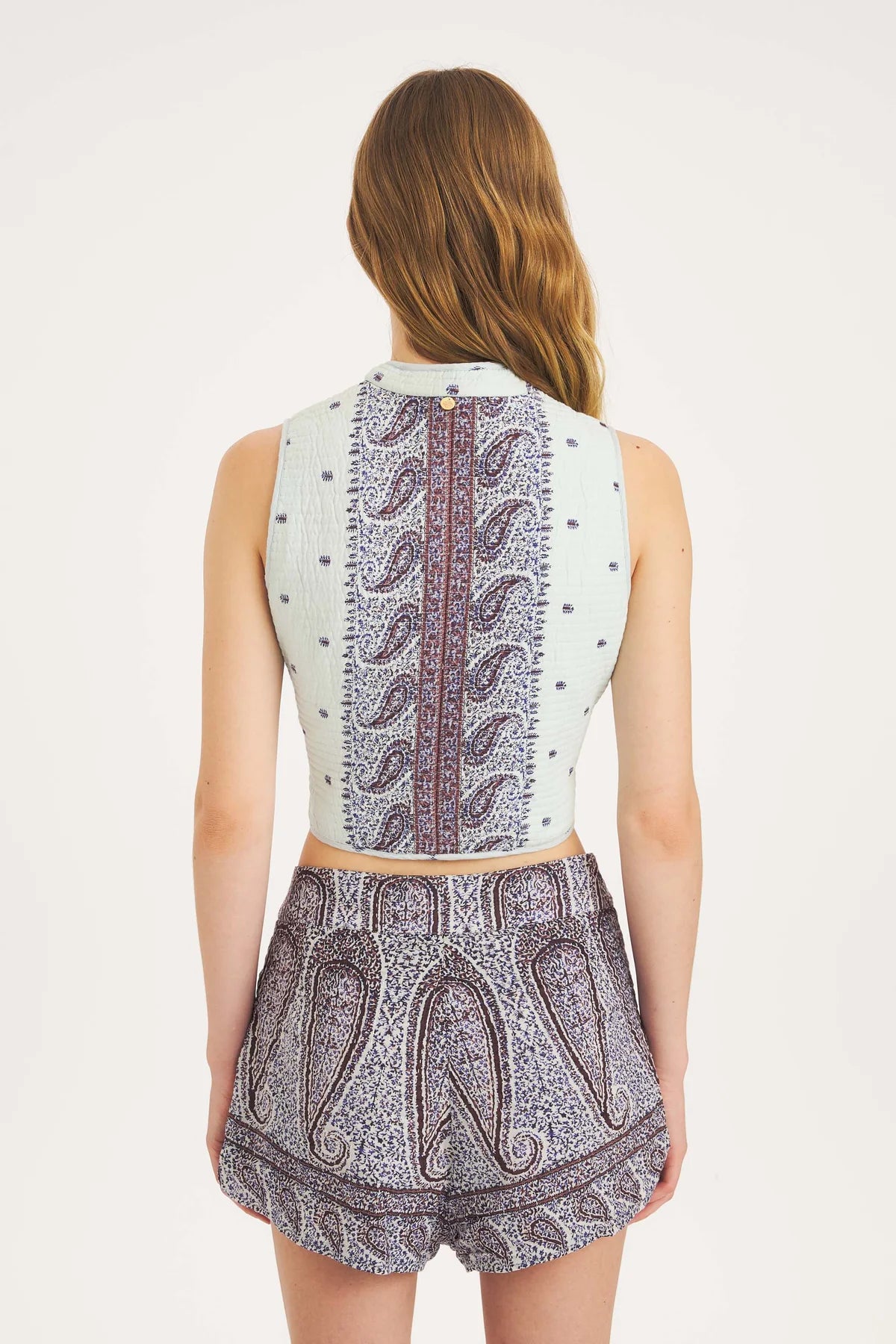 Cardigan corto in cotone dai colori vivaci, arricchito da una finitura trapuntata. Il suo taglio strutturato e cropped lo rende un pezzo di sovrapposizione senza sforzo, progettato per elevare il tuo look con facilità. Si chiude davanti con delicati bottoni in legno, aggiungendo un tocco naturale e raffinato. Il nostro motivo paisley distintivo, realizzato nel nostro studio parigino, è fatto a mano in India utilizzando tecniche tessili tradizionali, rendendo ogni pezzo sottilmente unico.
