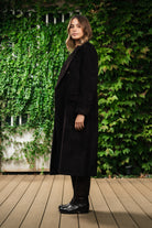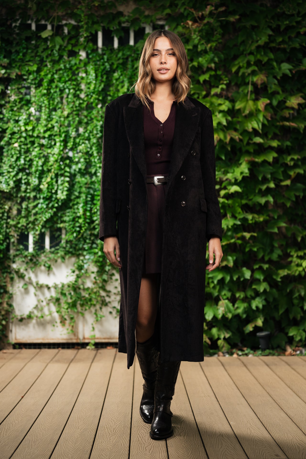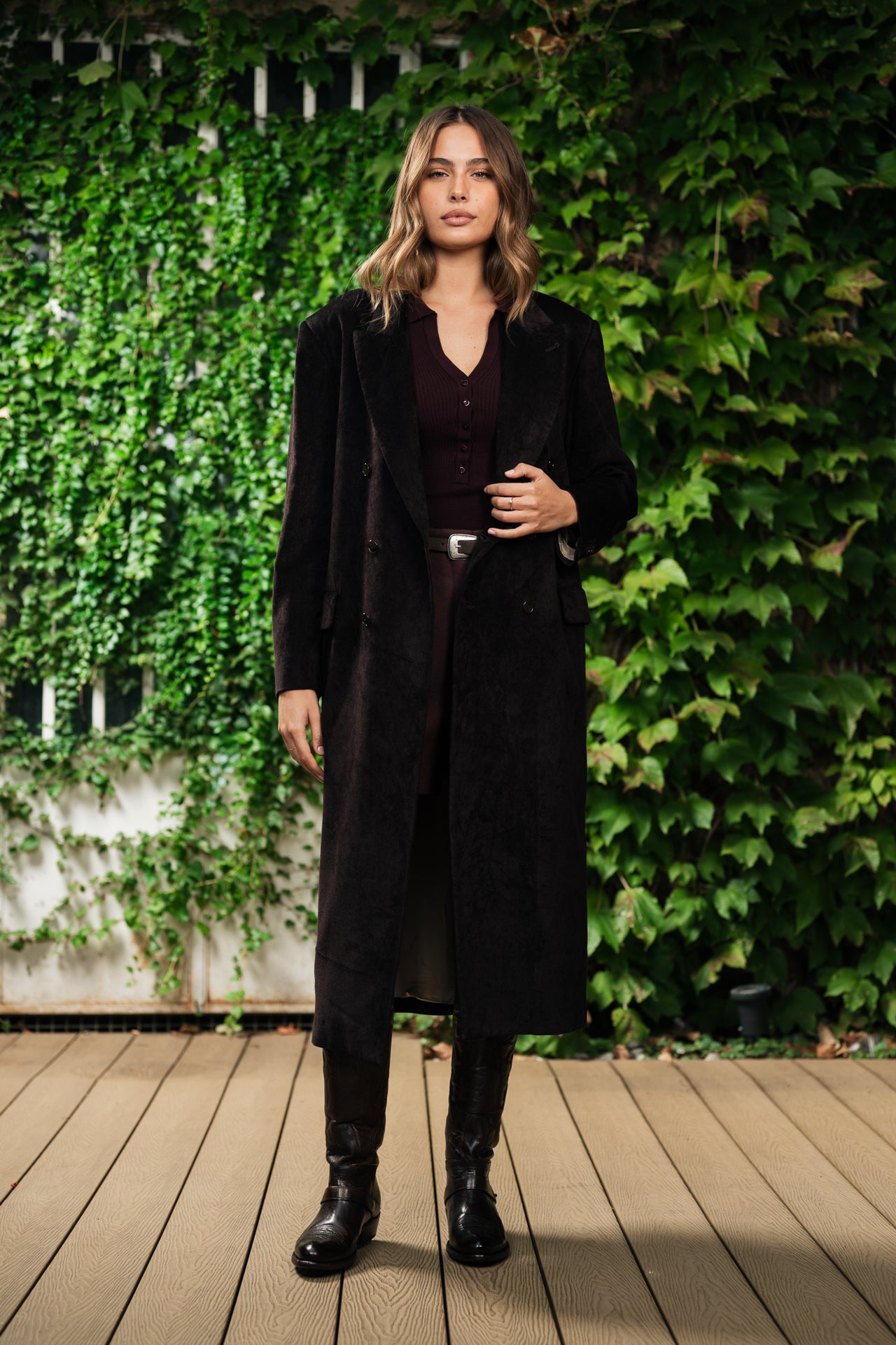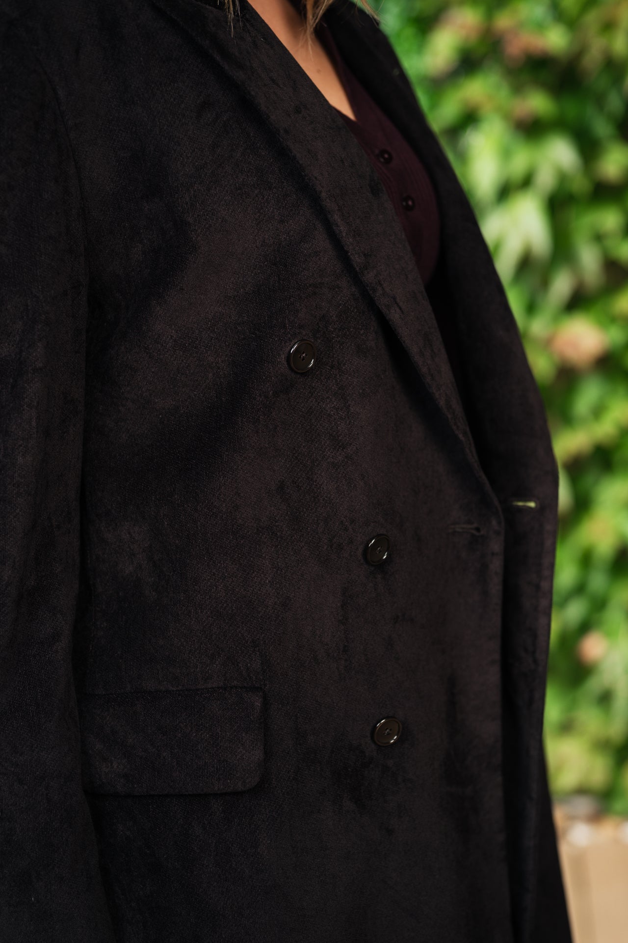Cappotto realizzato in un ricco velluto marrone, questo lungo cappotto doppiopetto è realizzato in un morbido mix di viscosa e cotone.